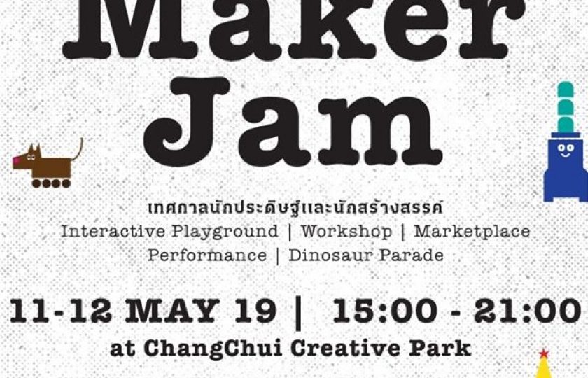 “Maker Jam เทศกาลนักประดิษฐ์และนักสร้างสรรค์” ปลุกพลังเมกเกอร์ในตัวคุณผ่านกิจกรรมที่ให้คุณได้ลงมือทำสิ่งประดิษฐ์ที่แหวกแนวไม่ซ้ำใคร พร้อมกิจกรรมมากมาย อาทิ Interactive Playground / Marketplace / Dinosaur Parade เล่นสนุกและเรียนรู้ไปกับ Electric Vehicles / Robots / Art&Craft / Interactive Music / Workshop / Performance ฯลฯ เข้าร่วมงานฟรี!! รายละเอียดเพิ่มเติม www.changchuibangkok.com